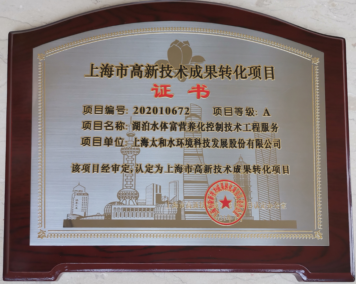 日前,太和水環境“湖泊水體富營養化控制技術工程服務”項目,被評定為:上海市高新技術成果轉化項目。上海市高新技術成果轉化項目認定,是經上海市高新技術成果轉化項目認定辦公室、上海市科技創業中心、上海科學技術委員會等權威機構,針對具有突出科研成果的高新技術企業,對研發的核心技術和有價值的產品內容,通過層層材料審核,篩選,評比,并最終做出的評選認定。