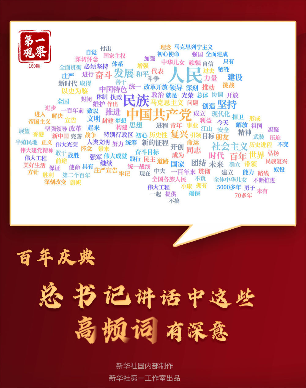 我們通過詞云大數據梳理講話中的高頻詞發現,出現86次“人民”、55次“民族”、54次“中國共產黨”……這充分印證中國共產黨的初心和使命,就是為中國人民謀幸福、為中華民族謀復興。