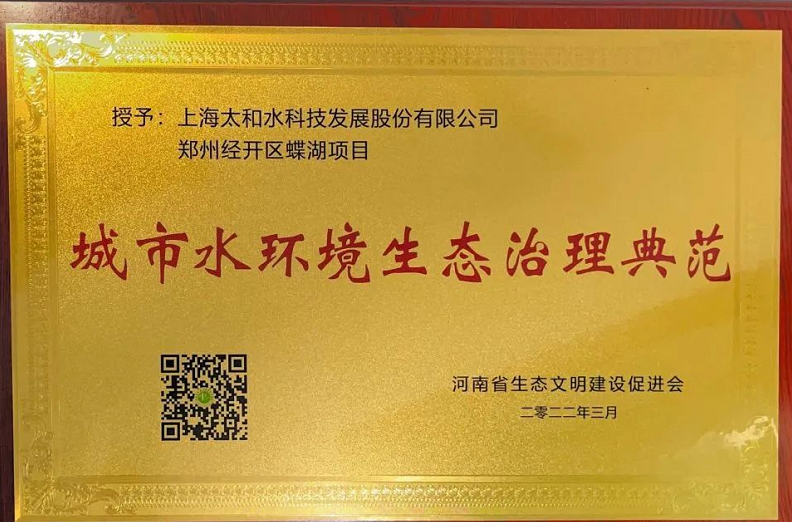 會議最后,河南省生態文明建設促進會為上海太和水科技發展股份有限公司頒發了“副會長單位”證書,并授予“生態環境治理突出貢獻企業”榮譽獎項,為我司承接治理的鄭州經開區蝶湖項目授予“城市水環境生態治理典范”獎項,為平輿天水湖項目授予“河湖水系生態修復范例”獎項。