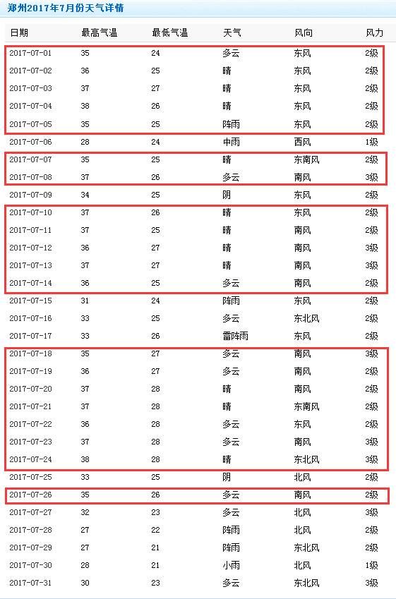 2017年7月鄭州天氣詳情(35°以上高溫天氣有20天)